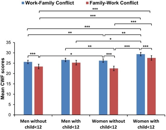 Differences in conflict work-family (CWF) between women and men with and without children under 12. * p < 0.05, ** p < 0.01, *** p < 0.001.
