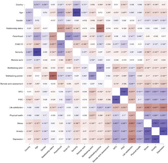 The relationships between the demographic, family-specific and work-specific variables, and well-being dimensions. Positive correlations are marked in violet while negative correlations are marked in red. * p < 0.05, ** p < 0.01, *** p < 0.001.