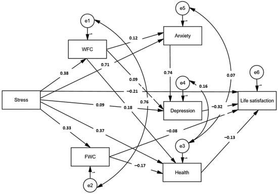 The last step of statistical analysis was developing the path model using SEM. The results are shown in Table 4 and Figure 3. All single-path and mediating effects were significant. Perceived stress increased WFC and FWC, anxiety, and depression and decreased physical health and life satisfaction directly. Both stress and WFC can decrease life satisfaction via a chain of anxiety and depression as mediators. WFC may also contribute to worsening life satisfaction through depression or bad physical health. FWC reduces life satisfaction directly and via better self-rated health. FWC is not related to anxiety or depression.