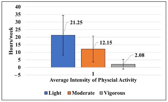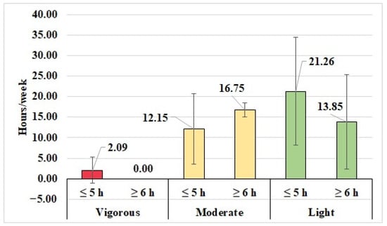 Most physical activities undertaken by C-DS were classified as low level (MET ≤ 3) 21.25 ± 13.11 h per week, followed by moderate level (MET 3–6) 12.15 ± 8.56 h per week. The least-often performed activity was vigorous physical activity (MET > 6) 2.08 ± 3.24 h per week (Figure 1).