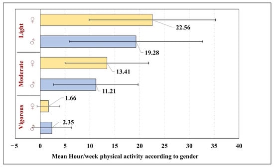 Children who spent ≤5 h using technology (2.08 ± 3.24 h/week) performed vigorous activities, whereas children who spent ≥6 h using technology did not perform any vigorous activities. Similarly, children who were engaged for 5 h or less using technology (21.25 ± 13.11 h/week) performed low levels of physical activities more than children who spent 6 h or more using technology (13.85 ± 11.52 h/week). Contrastingly, children who spent 5 h or less using technology (12.15 ± 8.56 h/week) performed moderate level of activities less than the children who spent ≥6 h using technology (16.75 ± 1.76 h/week) (Figure 3).