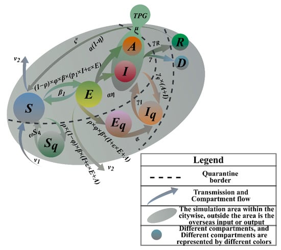 As shown in Table 2, we divided the populations in the transmission process into compartments of susceptible population (S) and exposed population (E), infected (symptomatic) (I), infected (asymptomatic) (A), target groups people (mildly infected population and asymptomatic infected and screened, TPG), quarantined and susceptible population (Sq), quarantined and exposed population (Eq), quarantined and infected population (Iq), population that died of a disease (D), and recovered population (R). First, we assumed contact tracing capabilities and high compliance with quarantine. While changing population size and testing rates is easily achievable, this may be an overly optimistic assumption for some institutions with limited capacity. This value should be parameterized using locally reported incidence data and underreporting estimates. The probability that the susceptible individual is infected and turns into an exposed individual in incubation period (infection rate) is β. In particular, a prevalence of 5% was measured in the strongly virus-carrying population, which we expect to be significantly higher than the estimated prevalence in the general population. We assume that infected individuals with strong symptoms have the same infectious rate φ as individuals with weak symptoms. The model also takes into account the relative infectiousness of asymptomatic individuals who may have lower infection rates than symptomatic individuals and the probability of conversion from exposed population to asymptomatic population is (1−ƞ). There may be significant differences in the prevalence of specific categories of the virus in the general population. In order to facilitate the analysis and calculation, we set the prevalence rate as θ. After screening and testing, those diagnosed as positive for COVID-19 were immediately quarantined in the model ω. Case quarantine involves completely reducing their contact rate during the infection. Some of these quarantined contacts may have been contagious but are no longer able to infect others once they are in quarantine. The removed patients were differentiated into cured and dead populations, and the conversion rates of the dead population from infected is γ, and the conversion rate of cured populations from infected populations is γR, which changed with time. In view of the fact that the isolated infected people will be sent to the designated hospital for isolation treatment with a certain probability, according to medical capacity, this part of the population is converted into hospitalized patients in this model. The isolation rate of is mainly affected by the hospital’s medical capacity. Our model is conservative (meaning it may overestimate the COVID burden in cities) because they are more likely to suffer from severe illness and death due to their older age. As the pandemic develops, the immunity of the population is likely to increase, so we added immunization rate to the model. The evolution results of the simulation show that if the population cannot obtain the ability of lifelong immunity, it will be fed back into the model’s circulation system with the system input rate.