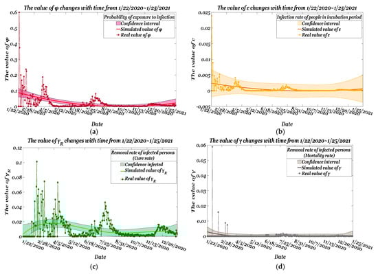 Comparison of real parameters and the varying rate of estimated parameters from 22 January 2020~25 January 2021: (a) φ; (b) ε; (c) γR; (d) γ.