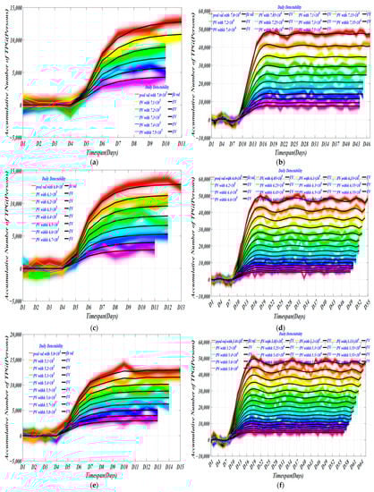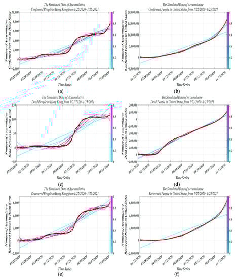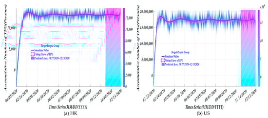 In Figure 4, for HK, as of 10 October 2020, the simulated target population is 13,043. The average numbers of asymptomatic and mildly infected are 7174 and 5869, respectively; and for the U.S., the simulated target population is 17,292,960, from which the average numbers of asymptomatic and mildly infected are 9,511,128 and 7,781,832, respectively. A related article pointed out that 30–60% of infections are asymptomatic or having only mild symptoms, but infectivity is not low. We took the average value of all symptomatic infections and the simulated value of asymptomatic to obtain the final average value of the target people group (TPG). In Figure 4, the hatched area is the estimated change in the number of cumulative cases of TPG in the future obtained by simulation.