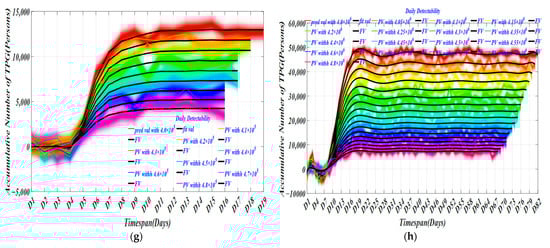 Changes in the number of TPG with different daily detectability. (a) The daily detectability from 700,000 cases to 750,000 cases with an interval of 10,000 cases in HK; (b) The daily detectability between [7,000,000 cases 7,500,000 cases] with an interval of 50,000 in US; (c) The daily detectability between [600,000 cases 670,000 cases] with an interval of 10,000 in HK; (d) The daily detectability between [6,000,000 cases 6,700,000 cases] with an interval of 50,000 in US; (e) The daily detectability between [500,000 cases 580,000 cases] with an interval of 10,000 in HK; (f) The daily detectability between [5,000,000 cases 5,800,000 cases] with an interval of 50,000 in US; (g) The daily detectability between [400,000 cases 480,000 cases] with an interval of 10,000 in HK; (h) The daily detectability between [4,000,000 cases 4,800,000 cases] with an interval of 50,000 in US.