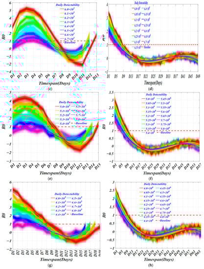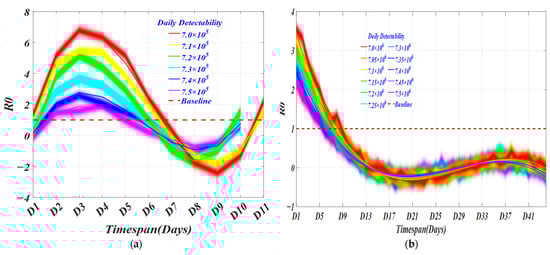 Another important parameter that is closely related to infectivity is the effective regeneration number, which measures the ability to spread the disease []. It can be simply interpreted as the average number of people infected by an infected person during the infectious period []. We made a horizontal comparison of R0 under each daily detection ability of same groups and obtained the optimal daily detection ability of different groups [].
