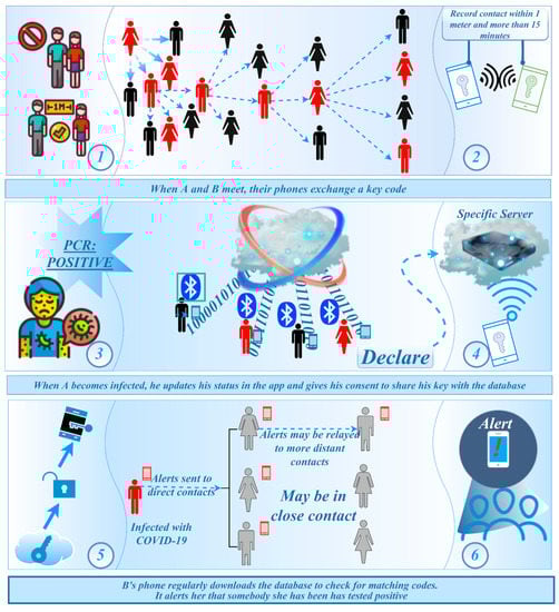 In Figure 7, BLE (Bluetooth low-energy) broadcasting technology is considered for use. This technology allows the device to broadcast information to other Bluetooth devices nearby through the Bluetooth low-energy protocol. Since the smart-phone basically has Bluetooth function, this technical solution has designed a way to collect information when contacting other devices at close distance []. The app is based on Bluetooth technology. After installation, it will run in the background of the smart-phone and generate an independent anonymous ID. When nearby users with the same app are approaching, it will automatically record the ID through near-field Bluetooth detection. If a user is found to be positive for the virus in the test, the ID will be marked in database. The app cross-checks the lists that match the ID. Once the users in the list are marked as infected, it will send a notification to the users to inform them that they are at risk of exposure. They are then encouraged to contact the local public health department for tests.
