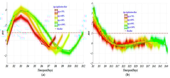 When the penetration rate of tracking applications in a country reaches 70%, the accurate tracking of populations can be achieved []. In Figure 8, with different app application rates (AAR), the spread rate decreases with the increase of the app application rate. The timespan for the vanishment of the virus transmission capacity is also nonlinearly reduced. When the app application rate is 100% (green curve), that is, in an absolute ideal state, if everyone uses the app to declare their health, the screening timespan required to end the epidemic is 7 days in HK. The cumulative number of people screened within 14 days of the incubation period is 6060. When the app application rate is 90% (light-green curve), that is, in an excellent state, the screening timespan required to end the epidemic is 5.5~6 days. The cumulative number of people screened within 14 days was 2901. When the app application rate is 80% (orange curve), that is, in a good state, the screening timespan required to end the epidemic is 5–5.5 days, and the total number of people screened is 2483. When the app application rate is 70% (red curve), that is, under the conditions of accurate tracking, the screening timespan required to end the epidemic is 5 days, and the cumulative number of people screened is 2065. For the U.S., the AAR is 9, 8, 7, and 5 days separately, corresponding to the total numbers of screening of 114,720, 90,695, 70,540, and 40,376.