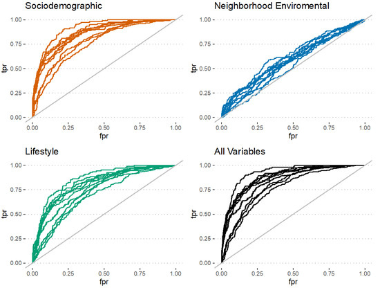 AUC values for the classification models trained to predict the latent cognitive function classes are shown in Table 3. Sociodemographic factors [AUC: 0.85, 95% CI: (0.67, 0.94), LM] were good predictors when using all models. Lifestyle factors [AUC: 0.78, 95% CI: (0.61, 0.89)] were also good predictors when using the GBM model. Neighbourhood environmental factors were poor predictors (<0.7) of cognitive function classes. The prediction was not substantially improved when variables were combined. ROC curves for different combinations of variables are provided in Figure 1.