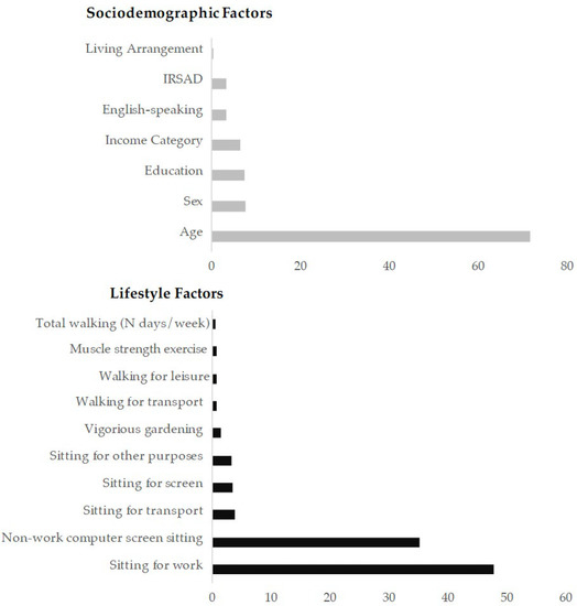 The relative contribution of each sociodemographic and lifestyle factor in training the machine learning model showing the best performance is provided in Figure 2. The most important sociodemographic feature was the chronological age (72%) of the participants, followed by their sex (8%) and education (7%). The most important lifestyle feature was sedentary behaviour (sitting for work [47%] and non-work computer-screen sitting [35%]).