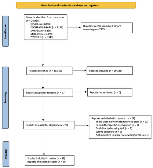 Chicago/Turabian StyleMoyo, Nompilo, Martin Jones, Diana Kushemererwa, Noushin Arefadib, Adrian Jones, Sandesh Pantha, and Richard Gray. 2022. "Service User and Carer Views and Expectations of Mental Health Nurses: A Systematic Review" International Journal of Environmental Research and Public Health 19, no. 17: 11001. https://doi.org/10.3390/ijerph191711001