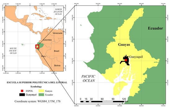The case study was conducted at the ESPOL Polytechnic University located in the northeast of the city of Guayaquil, Guayas, Ecuador, at the Gustavo Galindo Velasco Campus (Km. 30.5 of the perimeter road), as shown in Figure 1. According to the QS Latin America University Rankings 2021 [], ESPOL is ranked No. 74 among 411 universities in Latin America []. In addition, the Green Metric 2021 [] ranks ESPOL as the No. 1 university in Ecuador in terms of sustainability. Like other universities, ESPOL has given importance to physical activities from its beginnings to the present, providing scholarships to athletes and including in its curriculum complementary training subjects.