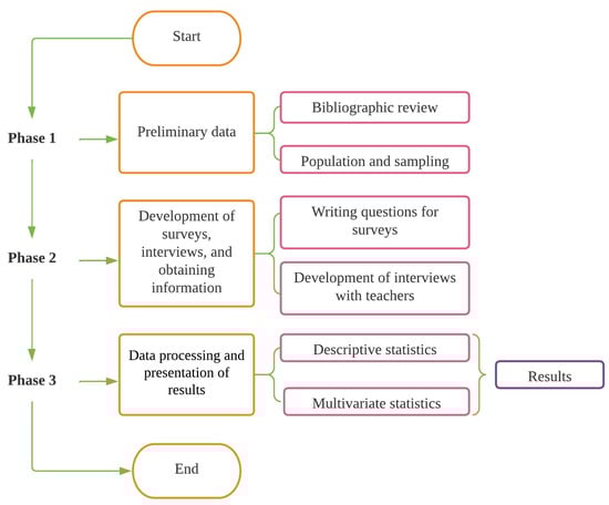 This work contemplates a methodological process consisting of three phases (see Figure 2), as follows: (i) preliminary data, in terms of the scope of the study, population, and sample size; (ii) survey development, interviews, and information gathering; (iii) data processing and multivariate presentation of results.