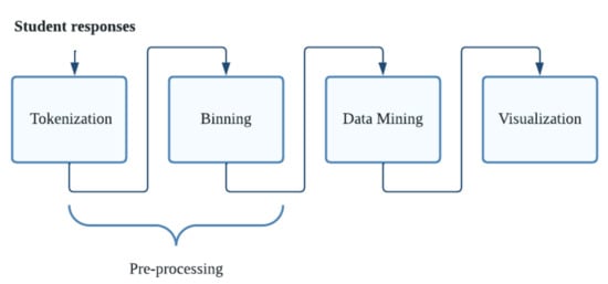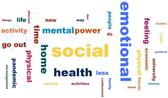 In the personal free-response question, we applied a text mining process to the open-ended question (the aspect of their life that they felt most affected by the confinement), where we obtained the word frequency of the answers given by the students in a word cloud graph. In Figure 3, we show the process. The preprocessing task consists of separating the words without connectors, punctuation, stop words, XML tags, lowercase, and special characters (tokenization), and creating the body of refined text (binning) to be able to carry out a data mining process. Finally, the visualization is carried out through a word cloud chart that shows a set of ideas or concepts according to their importance. Less essential words have more discreet sizes and often go unnoticed. For their part, the most important words have larger sizes and are able to better capture attention. Once the word cloud was obtained, the most representative terms were chosen [].