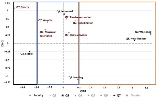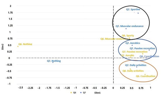 Figure 9 shows the variation of physical activity performed before (Q6) and during (Q7) the pandemic. In the first cluster (black color), one can see that the students who did sports and muscular endurance before the pandemic mostly kept doing only muscular endurance exercises during the pandemic. In the second cluster (blue), students who were doing aerobic exercise and passive recreation before the pandemic have continued with passive recreation and aerobic and coordination exercises during the pandemic. Finally, in the third cluster (orange color), students who engaged in daily activities and coordination exercises before the pandemic now only maintain daily activities during the pandemic.