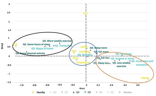 Figure 6 shows the relationship by faculty between the change in habits during confinement (Q4) and the student’s mood (Q5). In the first cluster (black color), it can be seen that FCV students feel happy to be at home and do more weekly exercise, and their hours of rest and physical activity remain the same before and after the pandemic. In the second cluster (blue color), most students from the FCNM, FADCOM, FIEC, and FCSH faculties report feeling bored, sleeping more, and eating more during the pandemic. Finally, in the third cluster (orange color), although there were few respondents from the FIMCP faculty, they responded that they feel loneliness, anxiety, stress, frustration, and discomfort. In addition, during the pandemic, they eat less and sleep less than before.