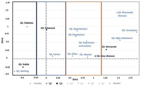 Figure 7 shows how COVID-19 confinement has affected students with diseases (Q2) and their evolution during confinement (Q3). In the first gradient, on the left side (black color), it can be seen how people who have had diabetes or no disease are stable during the period of confinement. In the second gradient (blue color), those who have had cancer improved during the pandemic. In the third gradient (orange color), which represents those who have had hypertension, obesity, respiratory diseases, depression, anxiety, and other illnesses, new illnesses have appeared during the pandemic. Finally, in the fourth gradient (grey color), circulatory problems and high cholesterol have worsened during the pandemic for those who have had rheumatic diseases.