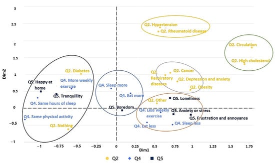 Figure 8 shows the emotional state (Q5) and living habits (Q4) of students with diseases (Q2) during confinement. In the first cluster (black color), one can see that the students with diabetes and no disease, who are calm at home, do more weekly exercise and have slept as before during confinement. In the second cluster (blue color), students reported boredom, more sleeping than before, and more eating than before, during confinement. In the third cluster (orange color), students who reported loneliness, frustration, discomfort, anxiety, and stress exercised less weekly, ate less than before, and slept less than before. In the fourth cluster (grey color), a high association between diseases can be seen, as those who have cancer also suffer from depression, anxiety, and obesity. Finally, in the fifth cluster (yellow color), those with hypertension suffer from rheumatic diseases.