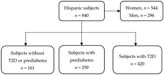 For this cross-sectional study, we used information from an open-population cohort consisting of consecutive recruited subjects between January 2018 and January 2020 at Unidad de Investigación de Enfermedades Metabólicas of the Instituto Nacional de Ciencias Médicas y Nutrición Salvador Zubirán (INCMNSZ) in Mexico City (Figure 1). Subjects with metabolic comorbidities such as type 2 diabetes (T2D) (previous medical history or HbA1c ≥ 6.5%), prediabetes (previous medical history or HbA1c ≥ 5.7%), both primary and secondary dyslipidemias, and different body mass indexes (BMI) were included. Medical and family history; sociodemographic, diet, physical activity data; and all measurements (described above) were obtained by trained staff. The Human Research Ethics Committee of the INCMNSZ approved the study with reference number 361, and all participants provided written informed consent.