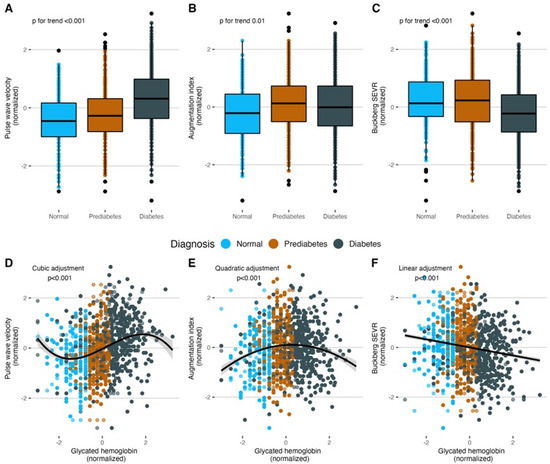 (A–C) Diabetes status has a positive association with PWV and AIX75 and a negative association with Buckberg SEVR. (D–F) According to BIC minimization, the best relationships of HbA1c are cubic for PWV, quadratic for AIX75, and linear for Buckberg SEVR. Given that the cubic relationship between HbA1c and PWV declined after adjusting for covariates, we present the regression analysis for PWV as a linear relationship. Abbreviations: PWV: Pulse-wave velocity. AIX75: Heart-rate-corrected augmentation index at 75 bpm. SEVR: Subendocardial viability ratio. BIC: Bayesian information criterion.