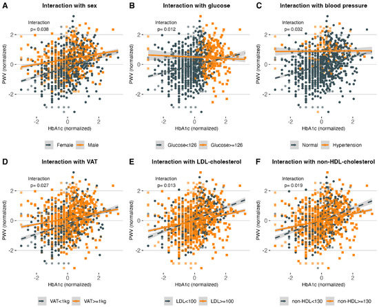 (A–F) show the interactions of sex, FGP, blood pressure, VAT, LDL-C, and non-HDL-C with HbA1c and PWV, respectively. The linear relationship between HbA1c and PWV is modified by sex, FGP ≥ 126 mg/dL, hypertension (SBP ≥ 140 mg/dL or DBP ≥ 90 mg/dL), visceral obesity (VAT ≥ 1 kg), LDL-C ≥ 100 mg/dL, and non-HDL-C ≥ 130 mg/dL. Abbreviations: HbA1c: Glycated hemoglobin. PWV: Pulse-wave velocity. FGP: fasting glucose plasma. VAT: Visceral adipose tissue. DBP: Diastolic blood pressure. SBP: Systolic blood pressure. HDL-C: High-density lipoprotein cholesterol. LDL-C: Low-density lipoprotein cholesterol.