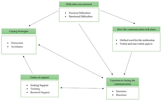 The TCA [29] of the narratives provided by the participants led to the identification of five themes: (1) how the communication took place; (2) the experiences during the communication; (3) the difficulties encountered; (4) coping strategies, and (5) forms of support (Table 3).