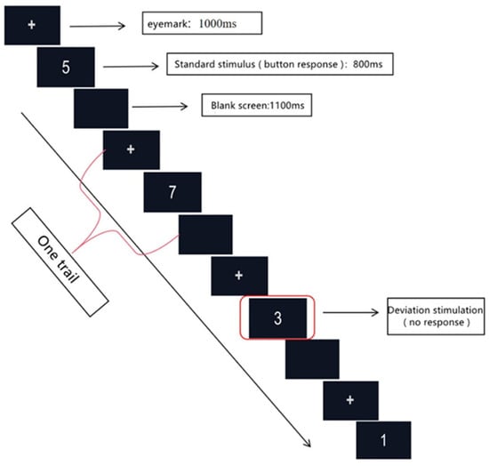 The stimulus material consisted of ten numbers from 1 to 9 (set the number format to Arial font, font size 48, white font presented in the center of the screen with a black background); the number 3 was the deviant stimulus, with 20% probability of occurrence, the remaining nine numbers (1, 2, 4, 5, 6, 7, 8, 9, 0) were the standard stimuli accounting for 80%, and all numbers appeared randomly in proportion. Subjects responded by pressing ‘P’ when the standard stimulus appeared, and not when the deviant stimulus (number 3) appeared.