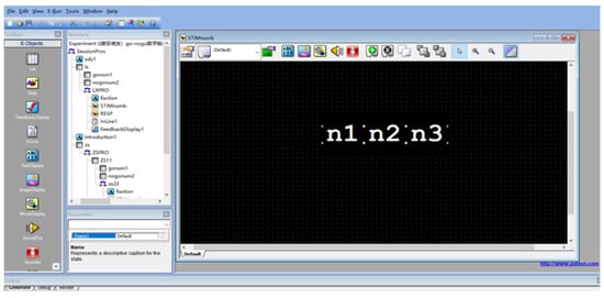 The continuous performance test (CPT) was used to induce brain fatigue in this experiment. CPT is also widely used to measure sustained attention, and a typical CPT presents a sequence of stimuli that requires the subject to maintain sustained attention while responding as soon as possible to a pre-set target stimulus []. The stimulus interface program for this experiment is programmed using E-prime software, which includes functions for experimental design, generation, manipulation, data collection, editing, and pre-processing for analysis. It also provides comprehensive timing information and event details (including presentation time and response time) for further analysis of relevant data, estimating how long the main test will take to run. Figure 2 shows a screenshot of the interface for programming CPT tasks using E-prime.