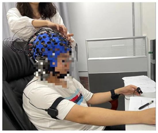 Figure 5 shows the subject being set up with an EEG cap on his head, a heart rate collector on his right arm, and an electrodermal collector on his left wrist. While the subject is undergoing the EEG experiment, the researcher sits quietly by and monitors whether the real-time data is being recorded correctly and efficiently, as shown in Figure 6.