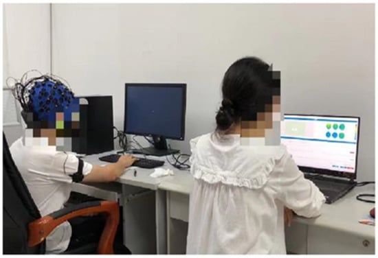For the experimental equipment, an ASUS ROG laptop was used for the simultaneous acquisition of subject data from EEG and eye movement signals using the ErgoLAB human–computer environment synchronization platform, synchronized with a Lenovo 19″ HD widescreen LED computer terminal monitor with a resolution of 1920 × 1080 pixels.