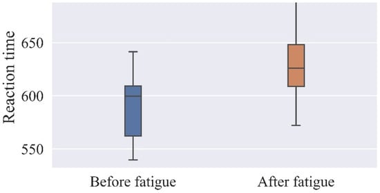 Figure 7 and Figure 8 show the reaction time and accuracy rate for each of the 17 subjects. In this experiment, the reaction time test used for the two EEG experiments before and after brain fatigue employed discriminative reaction time, and each subject’s reaction time was recorded for both phases of the EEG experiment. A total of 360 responses were recorded on the screen, 288 of which required a discriminative response, and the 288 response times of each of the 17 subjects were averaged for analysis. A percentage of the correct responses out of 360 is used to analyze the accuracy rate.