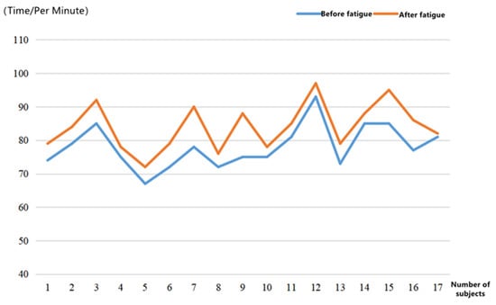 The critical flicker frequency (CFF) is the minimum frequency at which a person viewing a flickering spot of light may precisely create the stimulus that results in the sensation of flash fusion in the human eye. The settings in this experiment are: fixed green spot, fixed duty cycle 1:1, fixed spot brightness 1:8, fixed background brightness 1:4, and a continuously adjustable flicker frequency of 20 Hz~60 Hz. Each subject measured the current flicker fusion frequency with the highest accuracy, according to the specified test method. The flicker fusion frequency was averaged using three measurements to reduce data bias. Table 7 shows the flicker fusion frequency values recorded for each of the 17 subjects. Figure 9 shows a comparison of the flicker fusion frequency values before and after brain fatigue.