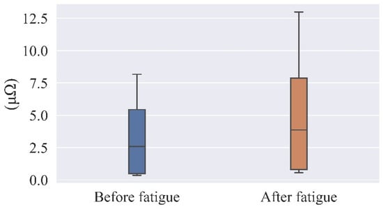 SC, or skin conductance, is utilized in the experiment as the indicator of the electrical signal properties of the skin, and its unit is μΩ. When a person is exposed to brain fatigue, stimulus conditions, or emotional changes, the skin resistance decreases and the electrical skin signal increases. Therefore, the subject’s brain fatigue state can also be effectively reflected by the electrical skin response signal as an indicator. Table 10 shows the KSS scores for each of the 17 subjects. Figure 11 shows the average skin electrical values of the subjects before and after brain fatigue.