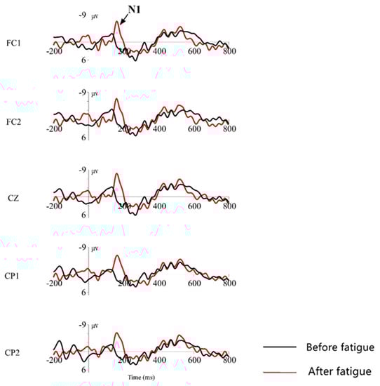 During the time window of 100 ms to 180 ms after the presentation of the standard stimulus, according to the ERP total mean map, the N1 wave was observed in the forehead zone, the central zone, and was more pronounced at five electrode points: FC1, FC2, CZ, CP1, and CP2; therefore, the brain signals from these five leads were selected for observation and demonstration. The total mean EEG waveforms induced at these five leads are shown in Figure 13, with a time window of 1000 ms, for analysis, where black represents the event-related potential waveform measured before brain fatigue was induced, and red represents the event-related potential waveform measured after brain fatigue was induced. It can be seen that the standard stimulus evoked a more pronounced N100 waveform, and that the mean waveform amplitude was significantly lower in the post-brain fatigue than that in the pre-brain fatigue group.