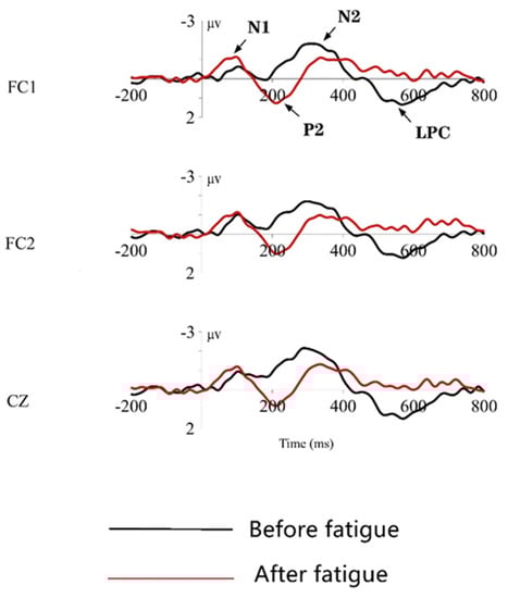 During the time windows of 150~200 ms, 200~260 ms, 260~400 ms, and 400~600 ms after the presentation of deviant stimuli, the N1, P2, N2, and LPC waves are observed in the frontal and central area, according to the grand mean maps of ERP. These waves are more pronounced at the three electrode points: FC1, FC2, and CZ; therefore, that brain signals from these three leads are selected for display. The total mean EEG waveforms induced at these three leads are shown in Figure 12, with an analysis time window of 1000 ms, where black represents the event-related potential waveform measured before the brain fatigue induction, and red represents the event-related potential waveform measured after the brain fatigue induction.