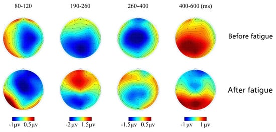 From the results of the ERP analysis, the wave amplitude of the N100 component involved in the early perceptual stages of cognitive processing in the presence of standard stimuli differed significantly between pre- and post-brain fatigue, with the N100 after brain fatigue significantly lower than before brain fatigue. As an exogenous EEG component, N100 is closely related to the brain’s cognitive processing of the physical properties of external information []. It primarily reflects the fact that early visual processing is based on attentional selection of objects. Using auditory stimulus elicitation, for example, a significant reduction in N100 wave amplitude was found as early as 1991, suggesting that subjects’ attention left the current task [], and that N1 facilitates the processing of task-relevant ideas []. However, a reduction in N1 wave amplitude would imply a decrease in the facilitation of task-related thoughts. The significant decrease in N1 amplitude following brain fatigue in the present study suggests that the attention required to process the same stimuli is shifted or deviated, and that brain fatigue inhibits the processing of external stimuli by attentional resources after sustained VDT operations, resulting in attenuation of attention and a decrease in sustained attention.