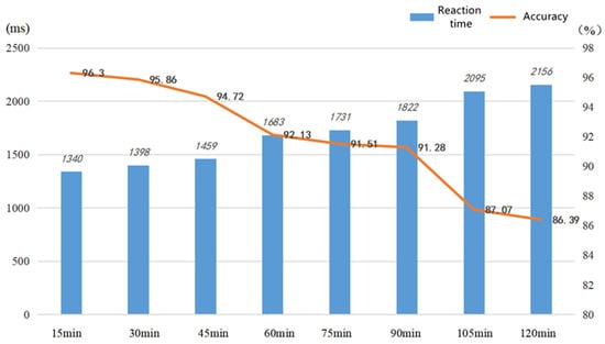In the experiment, accuracy rates, omission rates, reaction times, subjective KSS, and objective flicker fusion frequency meter data are recorded for all subjects performing the two-hour CPT (continuous operational task), as shown in Table 13. Subjects are required to maintain a high level of attention for cognitive continuous VDT operations during the 120 min CPT task, and the values recorded in the table are the mean values for all subjects at 15 min intervals.