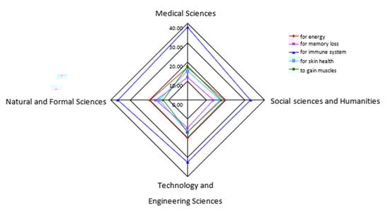The students reported using DSs with a wide range of claimed health effects. However, DSs are commonly used to support the immune system (39.1%), boost energy (20.1%), gain muscles (18.5%), improve skin health (17.3%), and boost memory (14.6%), without a significant difference when comparing students of different scientific fields (p > 0.05) (Figure 1).