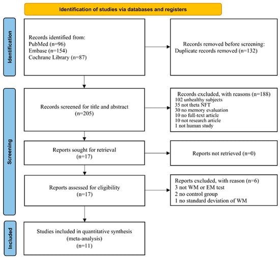 Figure 1 shows the PRISMA 2020 schematic flow diagram for the process of study selection. A total of 337 titles and abstracts were initially identified, 132 were removed due to duplicates, and 205 titles and abstracts were screened for relevance. One hundred and eighty-eight studies were excluded due to the following reasons: inclusion of unhealthy participants (n = 102); theta NFT was not conducted (n = 35); absence of memory evaluation (n = 30); not a full-text article (e.g., conference abstract) (n = 10); not a research article (e.g., review paper) (n = 10); and not a human study (n = 1). Seventeen studies were sought for retrieval and were assessed for eligibility. Subsequently, six studies were excluded as three studies did not perform a WM or EM test, two studies lacked a control group, and one study did not present the standard deviation of WM. Finally, 11 studies were included for the qualitative and quantitative analyses.