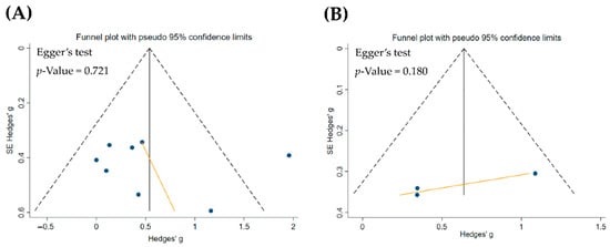Funnel plot and Egger test assessing publication bias for theta activity neurofeedback training (NFT) on working memory (WM) (A) and episodic memory (EM) (B). Each point represents an independent study for the indicated associate.