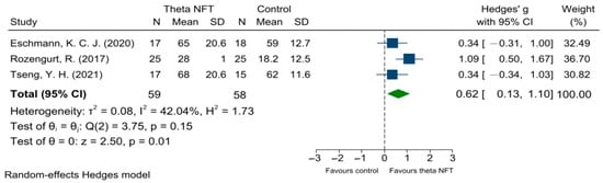 Figure 4 shows NFT of theta activity on the EM of healthy participants in 3 of 11 studies. Of these EM studies, two of three studies (66.7%) exhibited a significant EM enhancement compared with the control group. The results showed a significant overall effect (Hedges’ g = 0.62; p = 0.01; 95% CI = 0.13, 1.10; I2 = 42%), suggesting that NFT of theta activity could improve EM performance compared with the control group.