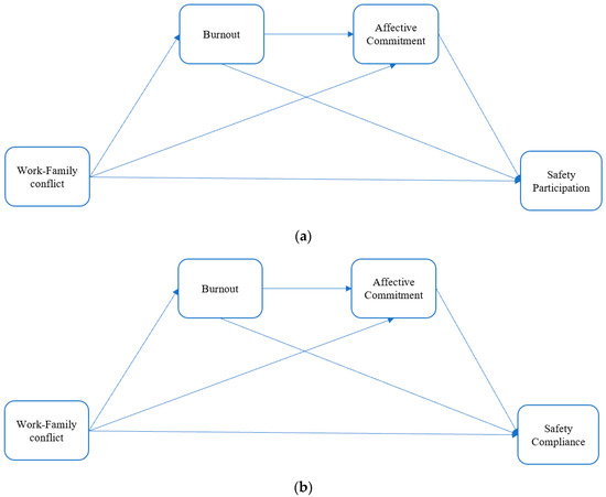The proposed chain mediation model of the impact of work-family conflict on safety performance. (a) Safety performance: Safety participation. (b) Safety performance: Safety compliance.