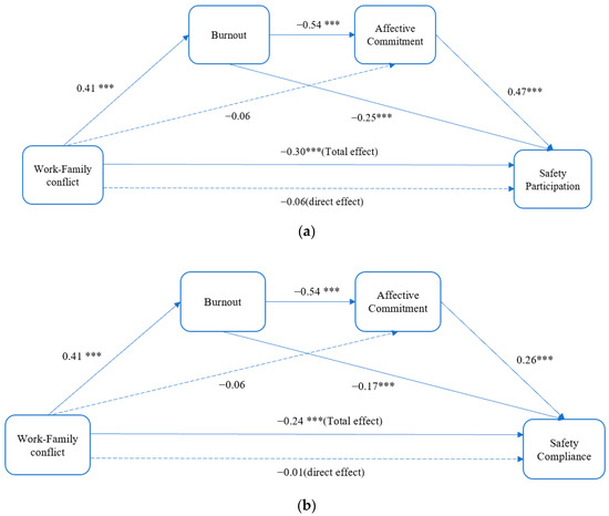 Figure 2a shows the chain mediating effect of job burnout and the sequential chain mediating effect of job burnout and affective commitment on the association between work-family conflict and safety participation. All the paths in this model were significant (p < 0.001), except for the association between work-family conflict and affective commitment (B = −0.06, p > 0.05) and the association between work-family conflict and safety participation (B = 0.06, p > 0.05). Figure 2b shows the chain mediating effect of job burnout and the sequential chain mediating effect of job burnout and affective commitment on the association between work-family conflict and safety compliance. All the paths in this model were significant (p < 0.001), except for the association between work-family conflict and affective commitment (B = −0.06, p > 0.05) and the association between work-family conflict and safety compliance (B = −0.01, p > 0.05). The results showed that the chain mediating effect of job burnout and affective commitment was significant. In addition, job burnout fully mediated the relationship between work-family conflict and both types of safety performance. However, affective commitment only partially mediated the relationship between job burnout and safety performance.