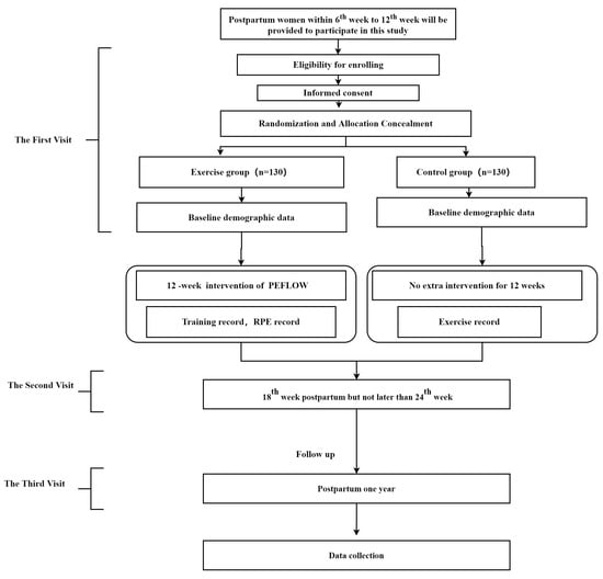 In referring to the above published studies and concepts and based on the previous study [27] of our team, our team from Peking University Peoples Hospital (PKUPH) developed a Pelvic Floor Workout (also named as PKUPH-PEFLOW), which focuses on training to improve the strength, endurance, flexibility, stability, and flexibility of core muscles, including diaphragmatic, abdominal, pelvic floor, and lower back muscles. We also designed a randomized controlled clinical trial to demonstrate the effectiveness of PEFLOW. The trial was designed on hypothesis that (1) a 12-week Global Pelvic Floor Workout would improve the pelvic floor muscle strength of postpartum women; (2) the 12-week Global Pelvic Floor Workout would positively impact on the overall function of postpartum women, including pelvic floor function, body posture, pain, etc.; and (3) body posture, physical activity level, trunk muscle endurance and strength would have beneficial effects on maternal overall function.
