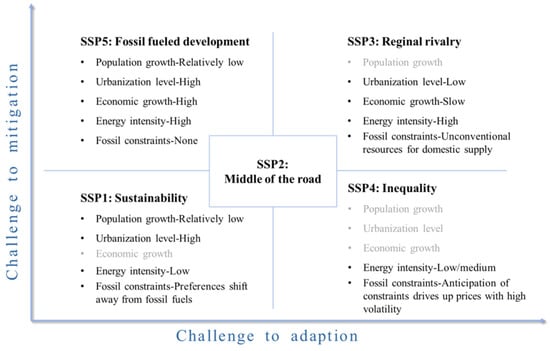 SSP defines five baseline scenarios, a brief description of which is given below []. Additionally, Figure 1 summarizes the future scenarios for the variables selected in this paper.