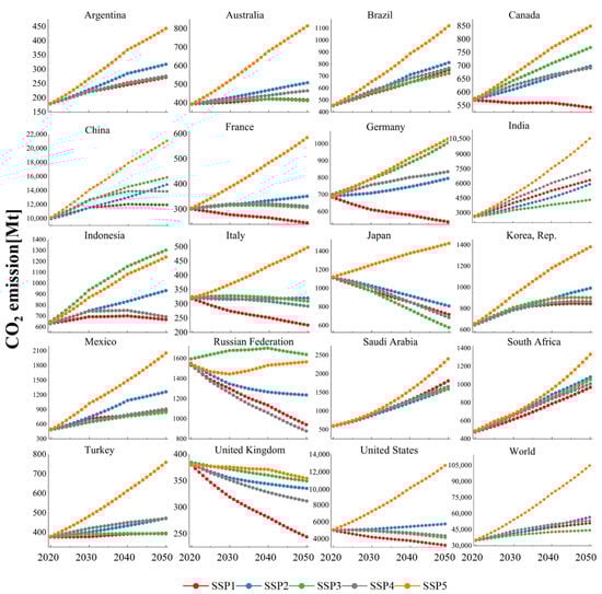 In this paper, the method of scenario analysis is combined with equation (3) to investigate the future evolution of CO2 emissions at both country and global level. With regard to scenario analysis, there are many studies that rely on the government’s social and economic development planning to set the scenarios, which has obvious planning characteristics [,,,,]. However, many drivers of CO2 emissions, in fact, have their own laws of growth. Relying too much on planning documents to set the scenarios will be unconvincing. Furthermore, it is inapplicable in the market-oriented environment of some countries. In addition to the scenarios drawn up by policy planning documents, Special Report on Emission Scenarios (SRES), Representative Concentration Pathways (RCP), and Shared Socio-economic Pathways (SSP) are also widely used for scenario setting in various studies [,,,,,]. Among them, SRES was developed in the early 1990s, which set four different possible future trajectories for population, economic growth, and greenhouse gas emissions. However, these scenarios are no longer applicable in the absence of some of the major changes that have taken place in society and the global economy in recent years. Since then, a team of researchers has developed RCP to describe possible future changes in radiative forcing caused by greenhouse gas emissions, which are reflected in the fifth report of the IPCC. However, its defect is that it does not set a matching socio-economic development scenario. In addition to RCP, another group of researchers developed SSP, whose baseline assumes no new climate policies. SSP sets out how various socioeconomic factors, including population, economic growth, urbanization, etc., will change in the future. In addition, SSP fully considers the growth rules of various socio-economic factors and can be used in combination with the climate change mitigation targets set by RCP [].