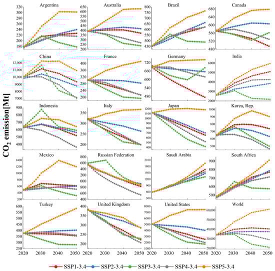 It should be noted that Argentina, Brazil, Saudi Arabia, and South Africa will have higher CO2 emissions in 2050 than in 2019 in both the SSP baseline and SSP-3.4 scenarios. This performance is mainly driven by a high energy consumption and high fossil energy consumption, although Argentina and Brazil are forecast to be unable to achieve lower CO2 emissions in 2050 than in 2019. However, combined with the previous analysis, it can be found that in the SSP-3.4 scenarios, the two countries can achieve the peak of CO2 emissions and maintain a steady decline in some paths. On the contrary, in Saudi Arabia and South Africa it will be difficult to maintain the downward trend of emissions.