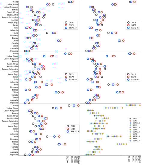 Figure 4 shows the comparison of CO2 emissions between 2050 and 2019 in the SSP baseline scenarios and SSP-3.4 scenarios. For the convenience of presentation, the horizontal axis of the graph uses a non-linear scale. From Figure 4, it can be seen that by 2050, the CO2 emissions corresponding to the SSP baseline scenarios are generally higher than those in the SSP-3.4 scenarios. This shows the importance of additional climate policies in achieving emission reduction goals. In addition, most countries will be able to achieve emission reductions in 2050 through at least one path.