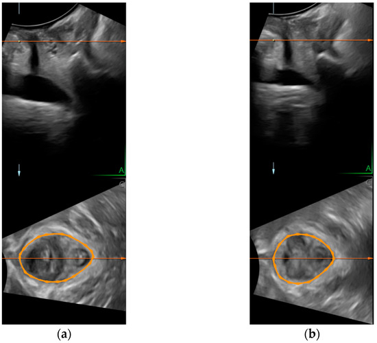 Example of a transperineal ultrasound image in the plane of minimal hiatal dimensions showing the levator hiatus (orange circle), which has changed into a more circular shape following pelvic floor muscle (PFM) training. Images were taken during a PFM contraction: (a) at baseline; (b) at the one-year follow-up.