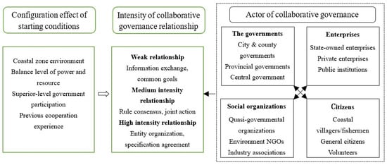 Collaborative governance is increasingly being used to solve global trans-regional environmental problems [1,2]. Effective collaborative governance has been achieved for interstate pollution control in the United States and provincial pollution control in Canada [3]. The coastal zone is the expansion area of the coastline to both sides of the land and the sea, and comprises an important intersection of land and sea ecosystems [4,5]. The coastal zone is an important part of the Earth’s resource system, and it is also an area where ecological environment problems may be concentrated and prominent [6,7,8]. On one hand, the flow of seawater can transport pollutants over long distances [9], the pollutants cannot be limited by administrative demarcation, many government departments and stakeholders are involved [10], and it is necessary to break through administrative divisions and carry out collaborative governance [11,12]. On the other hand, local government departments, enterprises, fishermen, and social organizations may have complex and conflicting interests [13]. For example, the government departments need to develop the economy and protect the environment; enterprises and fishermen need clean coastal environmental resources but may discharge environmental pollutants as well; and environmental protection social organizations need to emphasize their environmental protection objectives and also wish to obtain financial support from the government or enterprises, and their behaviors will have a lasting impact on the coastal environment [14]. Therefore, multi-level cooperation of stakeholders has become a key aspect of coastal environmental governance [15,16]. In practice, faced with the problem of environmental pollution, many countries have established joint pollution prevention and control mechanisms [17,18,19]. However, not all stakeholders can successfully establish medium–high intensity collaborative governance relationships [20,21]. Why can some stakeholders cooperate successfully, while some others cannot? What factors lead to the formation of medium–high intensity collaborative governance relationships?